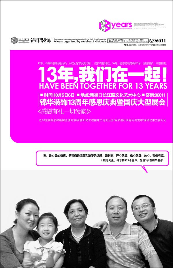 13年來,她服務了成千上萬戶家庭,為他們創造美好居家生活;13年來,她將優秀的設計、優質的施工質量和服務帶進千家萬戶,打造的品質家裝獲得了大家的肯定;13年來,從“放心家裝”到“好設計”,從“施工標準白皮書”到“96011客戶服務熱線”,無論是設計,質量還是服務,她總是走在家裝行業的前沿,她就是錦華裝飾。
